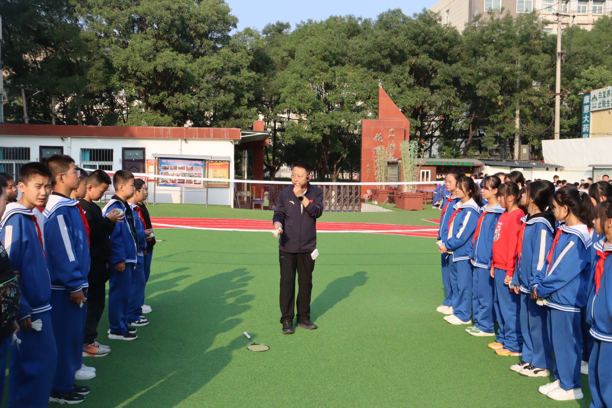 杨磊老师为小学生作了一场生动有趣的体育知识讲座,姜小峰老师现场指导小学生羽毛球动作技术,深厚的理论知识和专业的技术水平,深深地吸引着孩子们,大大地激发了孩子们的运动热情和兴趣。