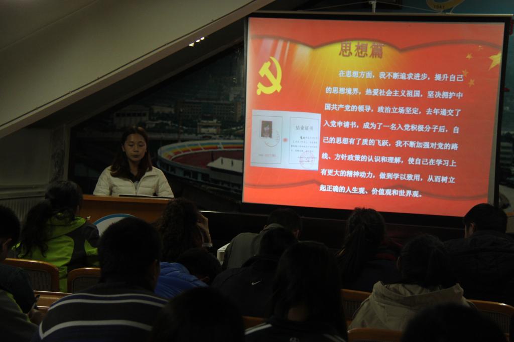 答辩分为自我汇报和回答问题两个环节。汇报环节,20名入党积极分子利用演示文稿陈述了他们对党的认识、入党动机以及在积极分子考察期内自己在学习、生活、工作、社会实践等各方面的表现,介绍了自己的优点和特长,分析了自己的不足,表达了他们希望早日加入党组织的迫切心情;回答问题环节,答辩者自选一道政治理论知识客观题作答,并回答评委的提问,以此考察答辩者的思想动态和综合素质。在持续了近4个小时的答辩过程中,入党积极分子们充分展现了自己的经历与特色,并从实际出发对评委们提出的问题做出了相应的解答,态度严肃认真,展现了参与答辩的同学们对党的理解和对社会主义核心价值观的思考。