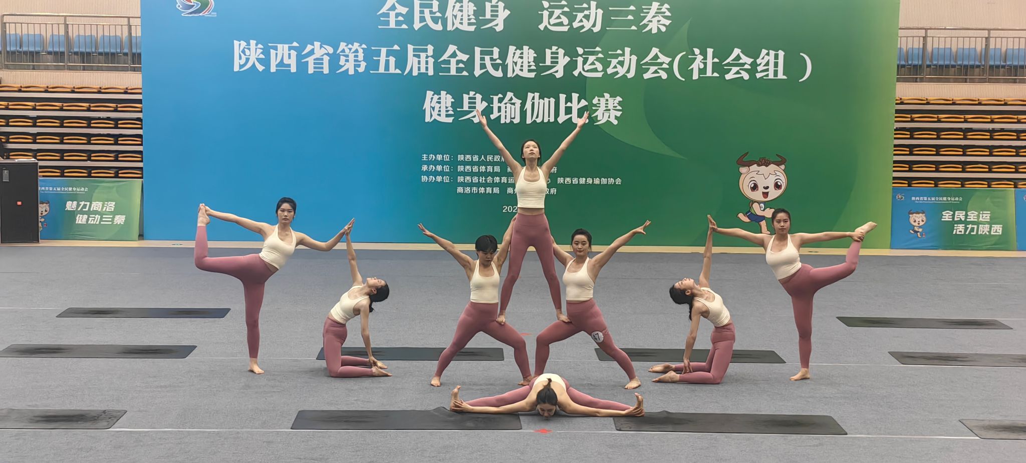 由陕西省人民政府主办,陕西省体育局、商洛市人民政府承办的2025年陕西省第五届全民健身运动会于9月19日-21日在商洛市商州区体育馆进行,91直播 派出了由*91直播 院长宗有智为领队、教师王辉为教练,贾咏荷等8名运动员组成的代表团参加了健身瑜伽项目比赛。