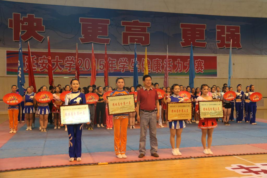 代表队最终获得总分并列第一名,外国语学院代表队获得第二名,文学院代表队获得第三名;政法学院代表队获得最佳团队组织奖,文学院代表队获得最佳音乐制作奖,物电学院代表队获得最佳成套编排奖,最佳健康活力团队奖授予了医学院代表队。田伏虎副书记、学工部部长高峰、校体委委员分别为获得各个奖项的代表队颁了奖。