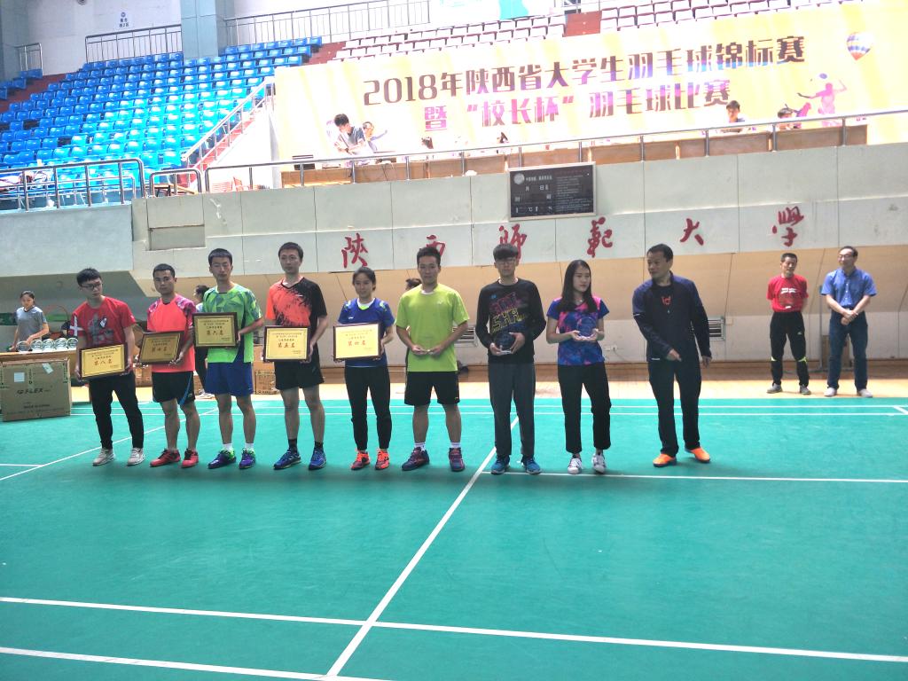 5月13日,由陕西省教育厅主办,陕西省学生体育协会、陕西师范大学承办的2018年陕西省大学生羽毛球锦标赛暨“校长杯”比赛在陕西师范大学长安校区落下帷幕。本次比赛为期5天,共来自全省55所学校900余名运动员参加,比赛分为学生组和“校长杯”组比赛。比赛项目设混合团体赛、男子双打赛、混合双打赛。
