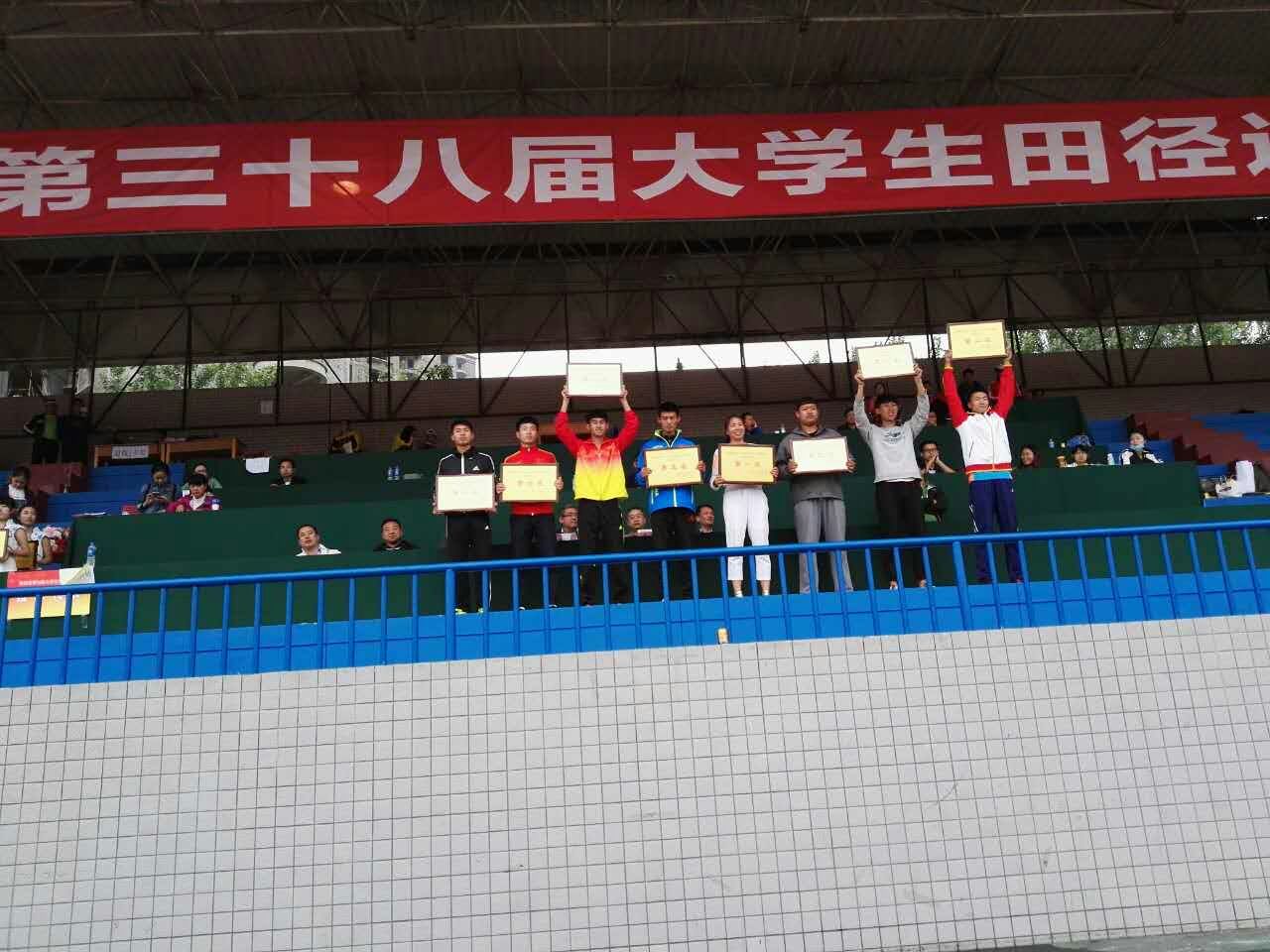 体教15级4班姚喜瑞获得男子乙A组十项全能第三名。另有4人获得第四名、5人获得第六名;3人获得第七名;2人获得第八名。马媛、杨子权、吴英林、程思维获得“优秀运动员”称号。薛宇、胡炜获得“优秀教练员”称号。