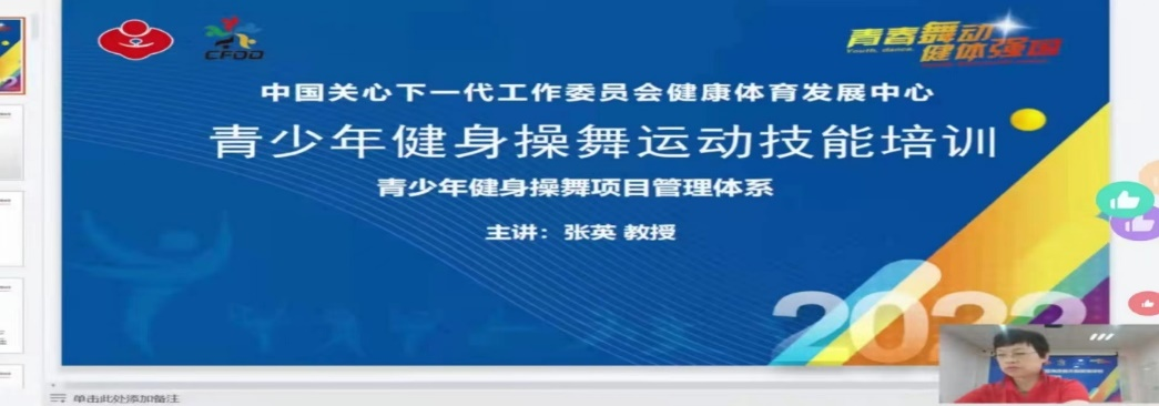 组织体操教研室教师、50余名学生参加由中国关心下一代工作委员会健康体育发展中心和陕西省学校体育协会主办的2022年健身操舞运动技能执教员、测评员线上培训(陕西站),本次培训旨在为陕西省大中小师生提供线上交流平台,助推 “体育+艺术”教学内容,乘势而上谱写陕西操舞类项目发展新篇章。