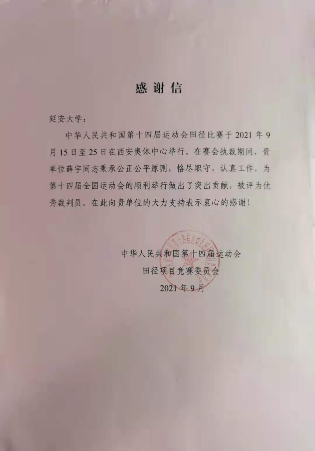 薛宇副教授受中华人民共和国第十四届运动会田径竞赛委员会邀请,参与田径比赛场地和马拉松比赛的执裁工作,获得“优秀裁判员”称号,载誉归来。随着十四运田径比赛的落幕,学校收到来自十四运田径竞赛委员会的一封感谢信,这既是对薛宇老师执裁能力的认可,也是对*91直播