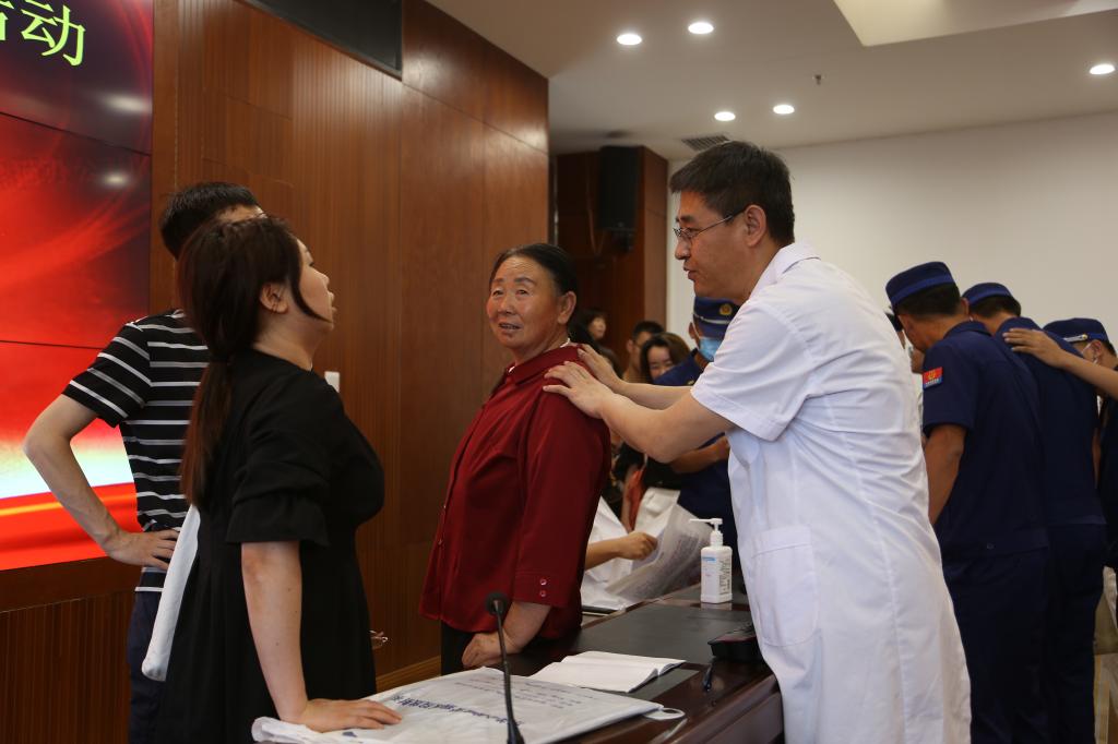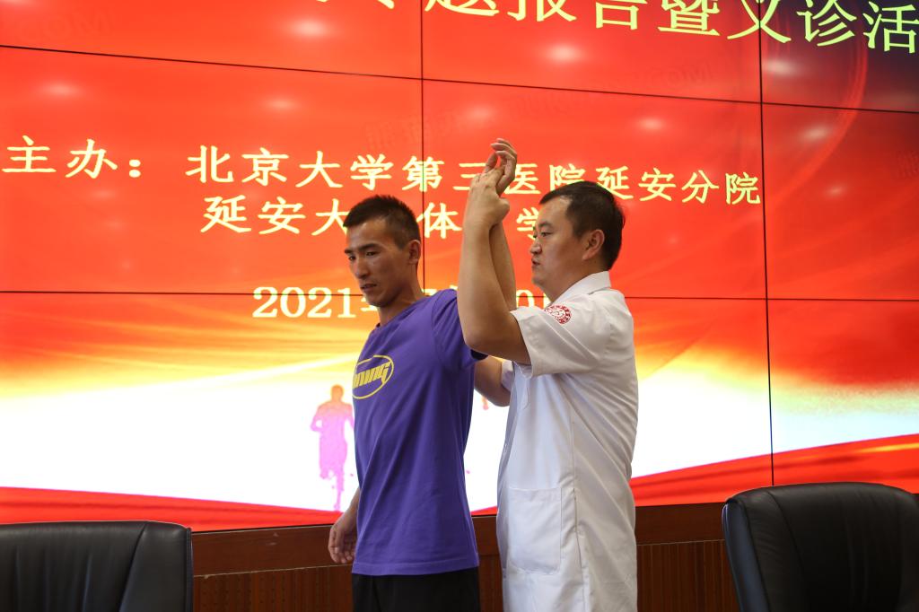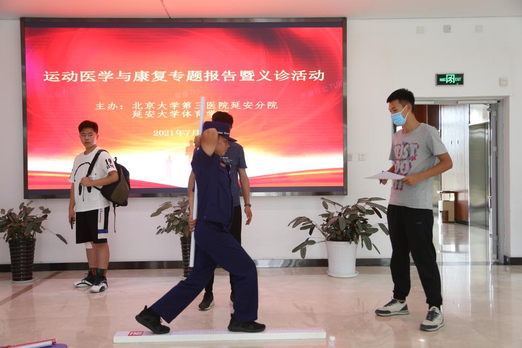 行政楼一楼举行运动性疾病与运动康复专题报告暨义诊活动,北京大学第三医院延安分院运动医学科主任庞军教授、北京大学第三医院运动医学科专家王佳宁博士、张志宇副主任、苏晨晨医师,延安消防救援支队新训大队队长张翼鹏,北医三院延安分院医护人员、*91直播
