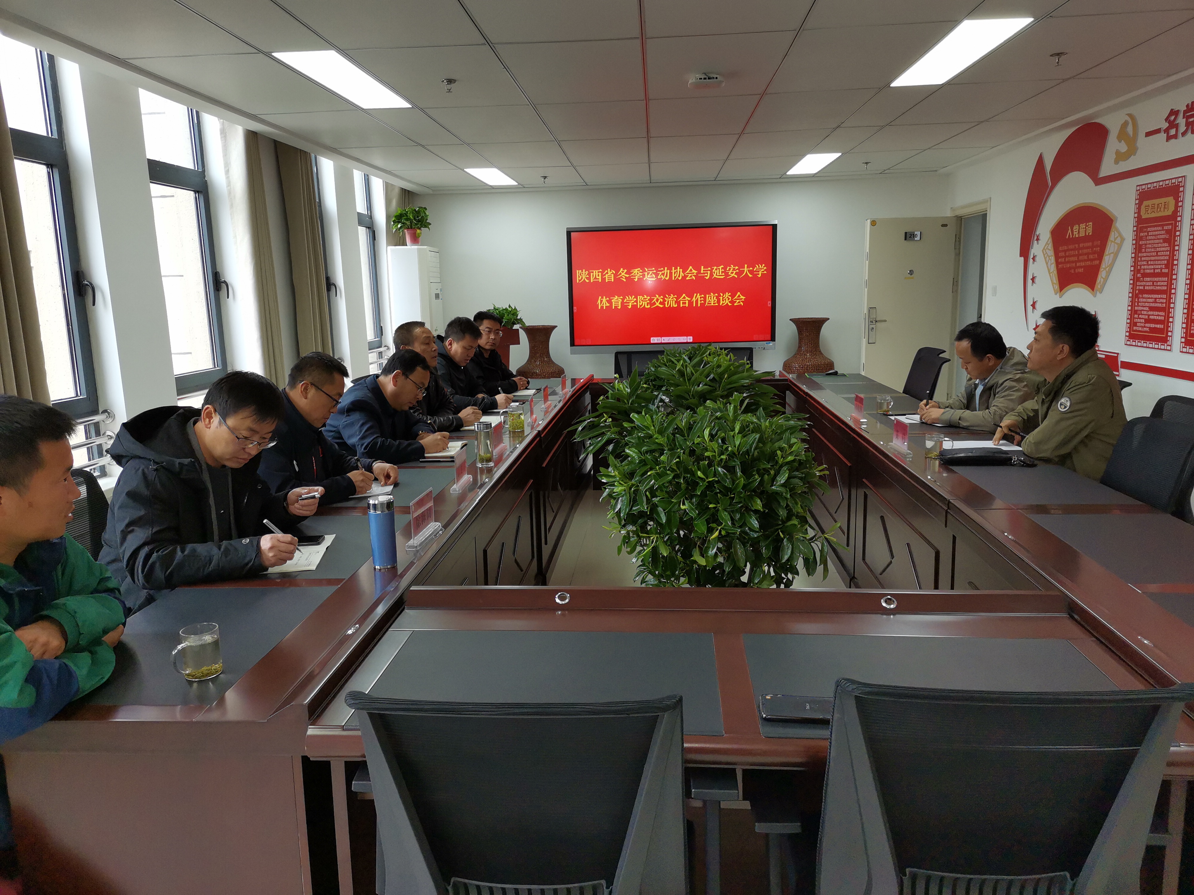 在学院会议室举行了交流合作座谈会,陕西省冬季运动协会秘书长黄伟、高山滑雪委员会主任杨小辉、*91直播