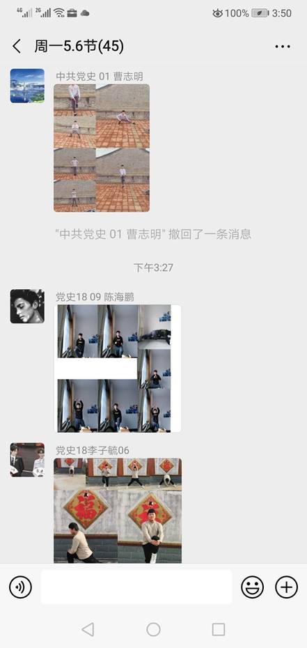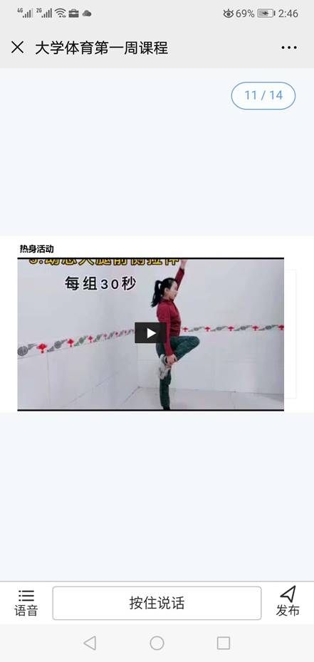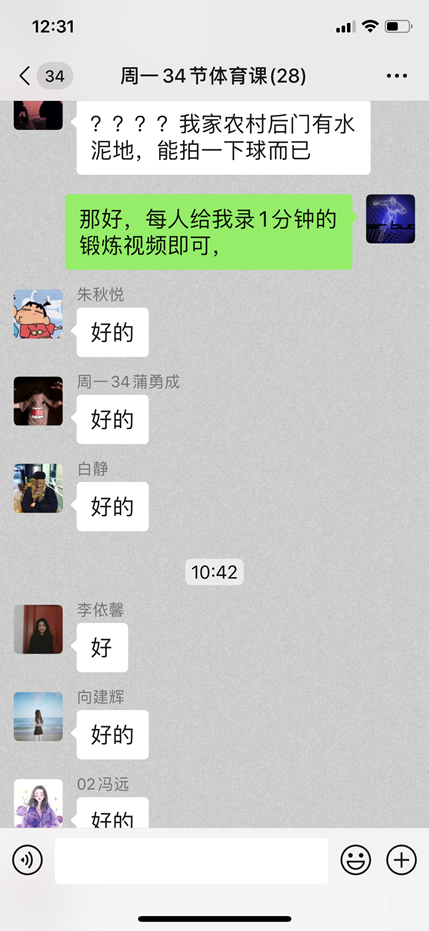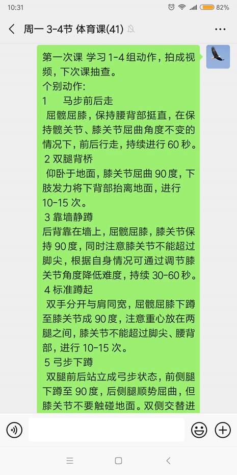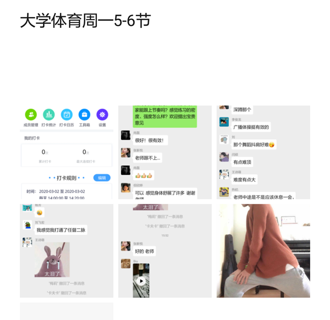 新冠肺炎疫情防控期间大学体育实施方案》,从六个方面对在新冠肺炎疫情期间的《大学体育》课进行详细安排,利用雨课堂;智慧树;腾讯会议;钉钉直播;微信等平台,围绕“全程关爱,全面育人”的目标,整合现有资源,体现体育教学特色,引导学生积极参加体育锻炼,缓解心理压力,提高身体素质,增强身体抵抗力和机体免疫力。根据《大学体育》教学大纲要求,结合体育课特点,考虑居家锻炼的环境和条件,推送以身体素质的体能训练为主,各个运动项目为辅的教学内容,采用课堂教学和日常锻炼指导等多种方式进行。教师面对疫情,教学热情高涨,学生响应积极,课堂效果良好,目前课程正有序开展中。