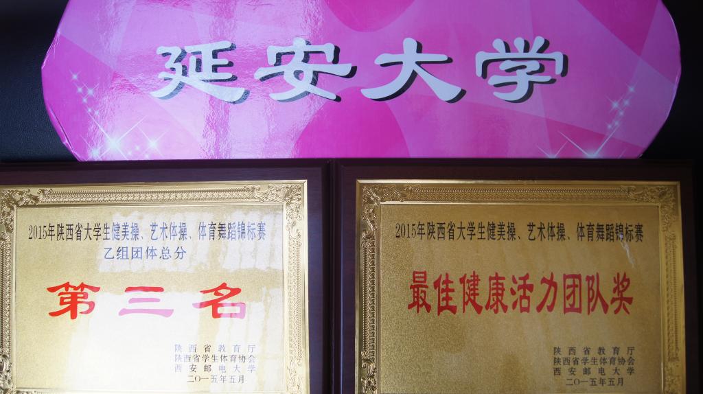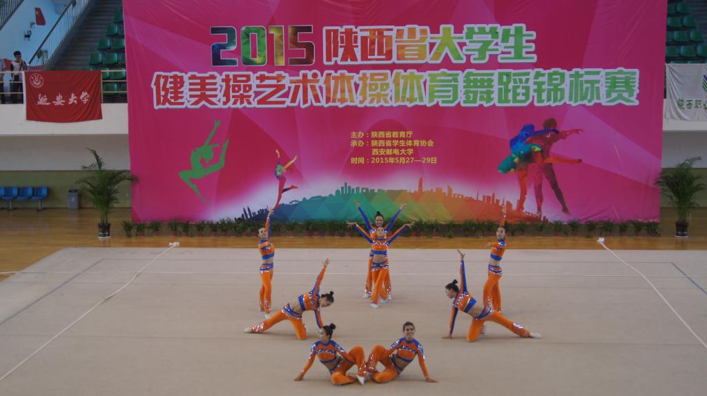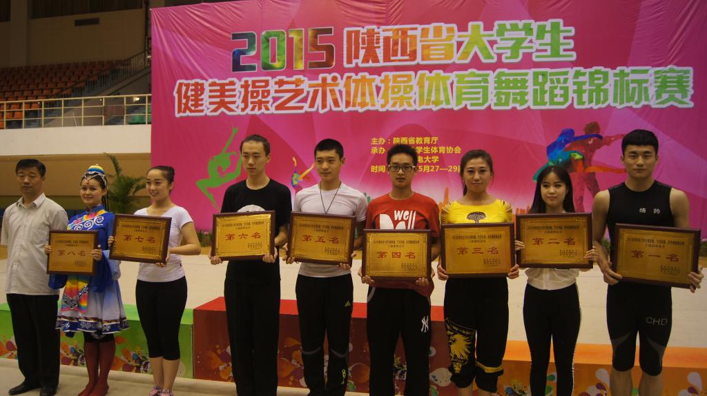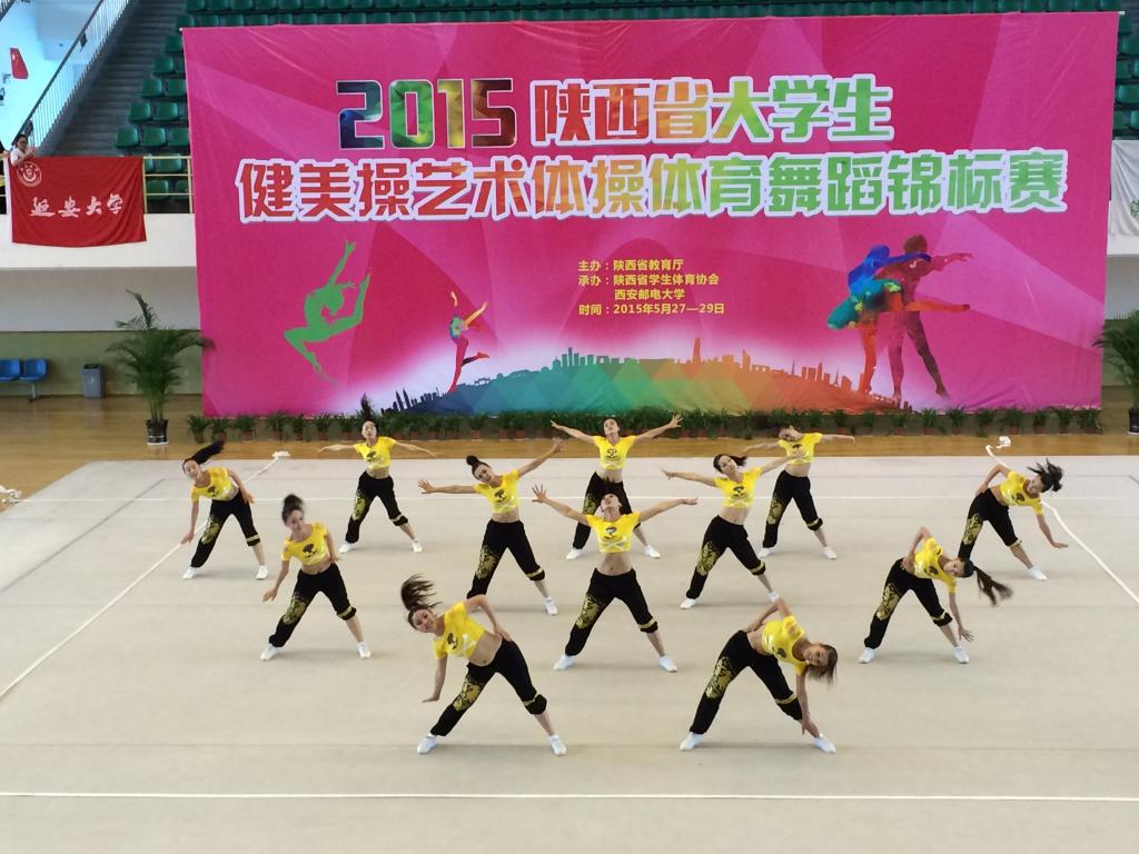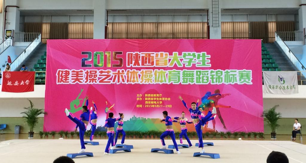 由陕西省教育厅主办的、陕西省学生体育协会、西安邮电大学承办的2015年陕西省大学生健美操锦标赛,于5月27至31日在西安邮电大学长安校区体育馆举行。由6名老队员和12名新队员组成的健美操队,在领队郑兵、教练宗延伟、张智颖的带领下,经过赛前一个多月的精心编排与刻苦集训,并希望通过本次比赛为年底的全国比赛积累参赛经验。在与教育部批准的设有高水平运动队和体育特长生单独招生的高校同组参加的C组比赛中,参加的4个项目中有3个项目进入前三名,其中街舞Jazz规定套路获得第一名;中国风健身舞-神秘雪山获得第二名;有氧舞蹈自编套路获得第三名,最终获团体总分第三名,并获“最佳健康活力团队奖”。宗延伟老师被评为“优秀教练员”冯梦娇、岳晓旭同学被评为“优秀运动员”。