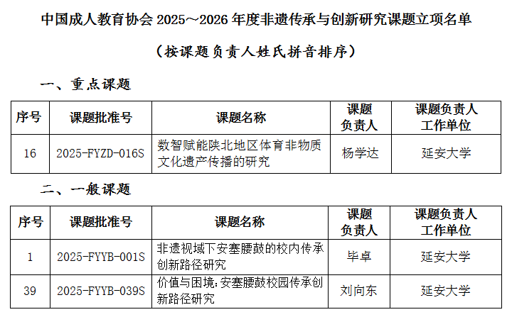 近日,中国成人教育协会发布了《关于公布2025-2026年度非遗传承与创新研究课题立项的通知》,经过中国成人教育协会非遗传承教育培训专业委员会组织专家评审、专委会审议通过,22项重点课题、86项一般课题准予立项。