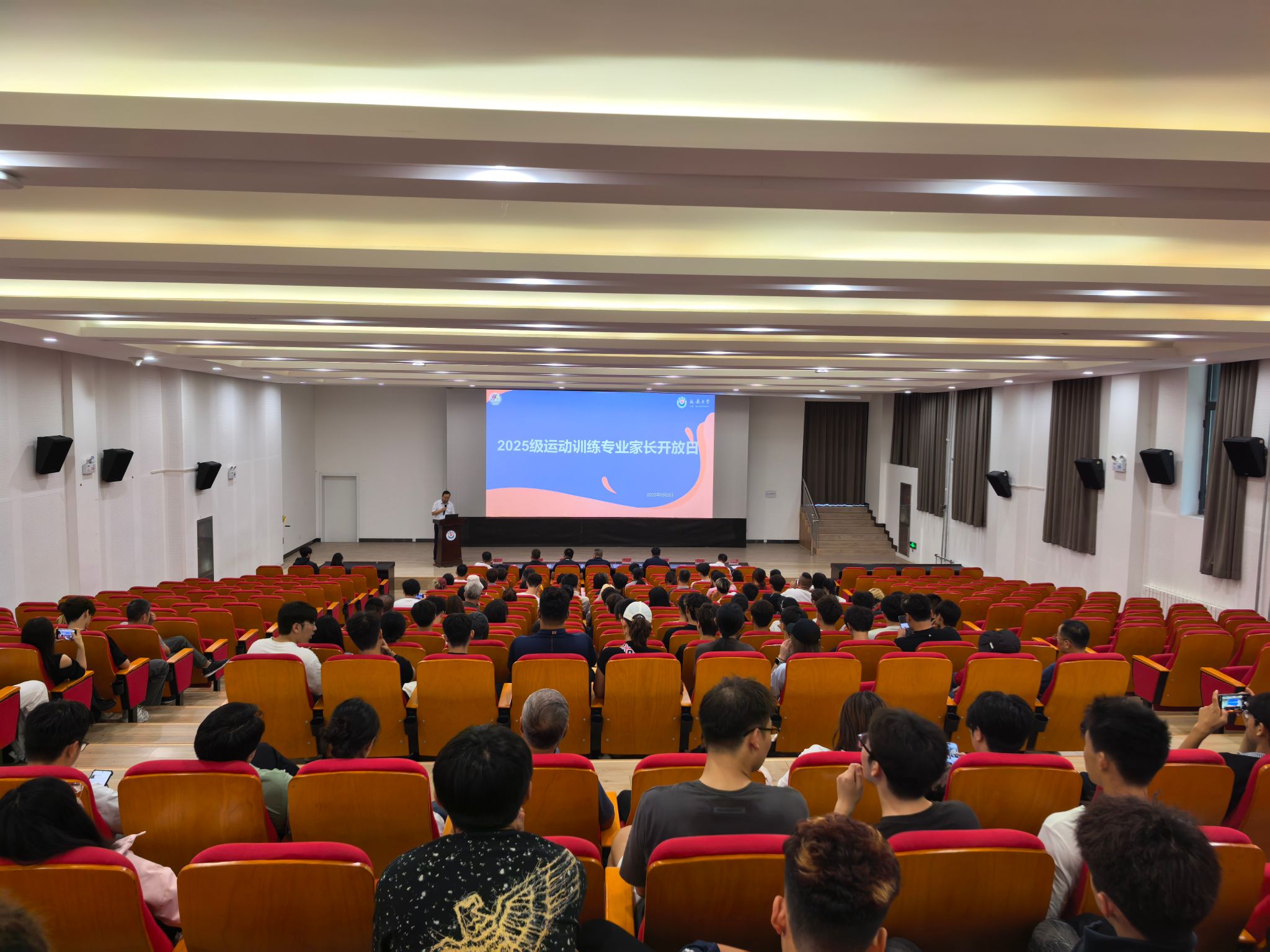 2025级运动训练专业新生家长座谈会在大学生活动中心红色影院举行。学院领导班子、各系主任、全体新生及家长参加会议,会议由运动训练系主任杨晓光主持。